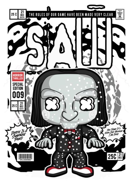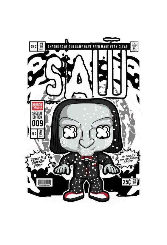 Billy the Puppet (Saw) σε Funko Pop στυλ κόμικ, κόκκινα μάγουλα, παπιγιόν, τίτλος "SAW" και quotes.