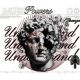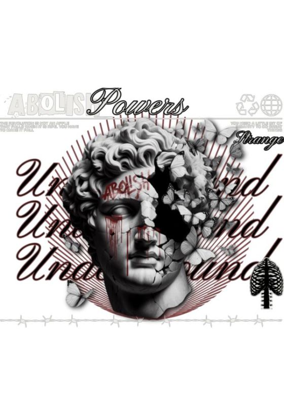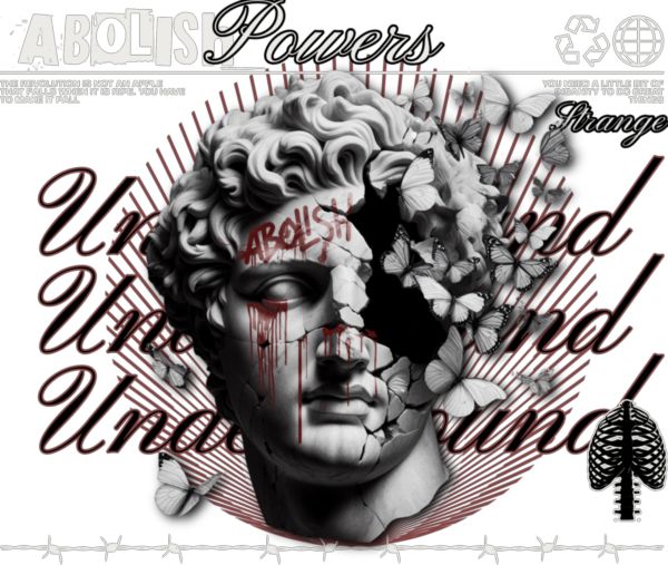 Μαρμάρινη προτομή σπασμένη με κόκκινο σπρέι «ΚΑΤΑΡΓΗΣΗ». Λευκές πεταλούδες, συρματόπλεγμα και κείμενα περί επανάστασης.