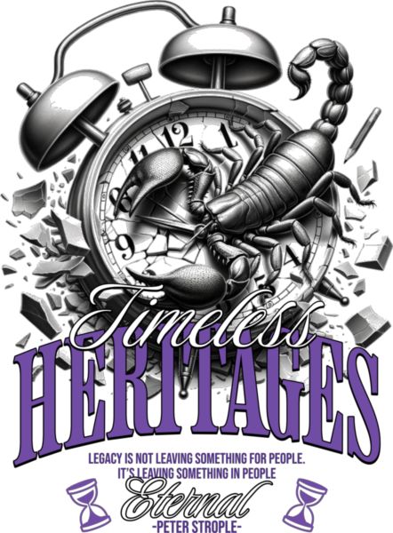 Σκορπιός πάνω σε σπασμένο ξυπνητήρι. Κείμενο «Timeless Heritages».