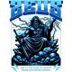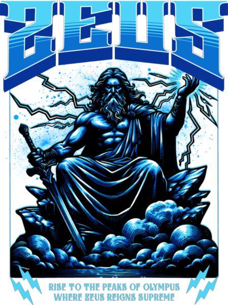 Ζευς σε σύννεφα/αστραπές με σκήπτρο· μπλε/μαύρη παλέτα, θεϊκή εξουσία.