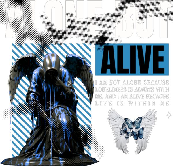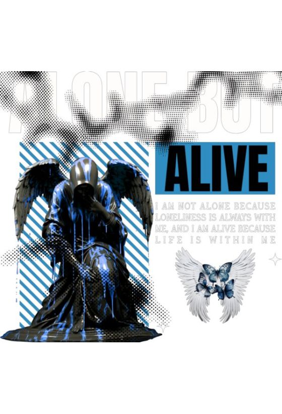 Μαυροντυμένη φτερωτή φιγούρα με κουκούλα, γονατιστή, σε μπλε και μαύρο φόντο. Κείμενα «Μόνος αλλά Ζωντανός» και ρητό για τη μοναξιά και τη ζωή. Στοιχεία με φτερά και πεταλούδες.