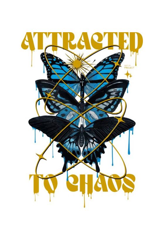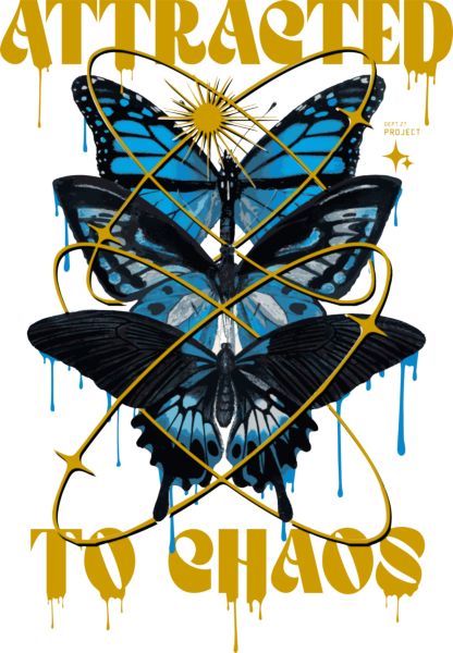 Τρεις μπλε-μαύρες πεταλούδες με χρυσά γράμματα «ΕΛΚΥΜΕΝΟ ΤΟ ΧΑΟΣ» και γεωμετρικά μοτίβα.