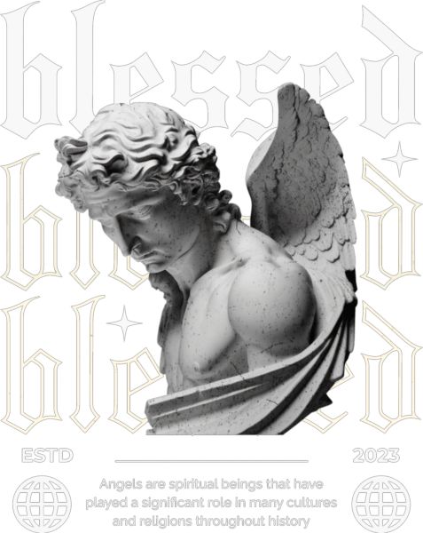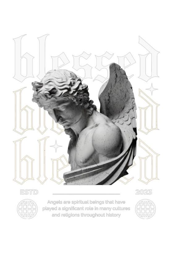 Μαρμάρινο άγαλμα αγγέλου με επιγραφή «Ευλογημένος», γοτθική γραμματοσειρά.
