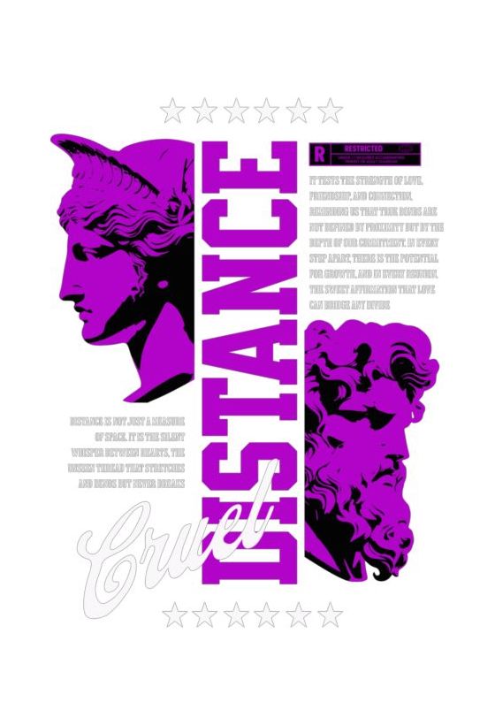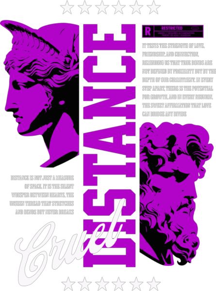 Δύο μπούστα σε μωβ αποχρώσεις και κείμενο «DISTANCE». Μήνυμα για απόσταση και δεσμούς.