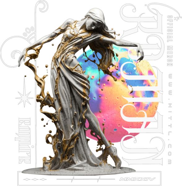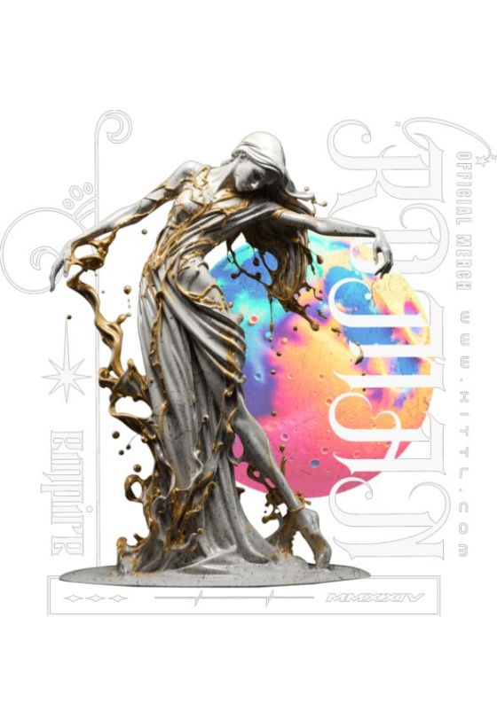 Μαρμάρινο άγαλμα γυναίκας με χρυσό υγρό, κοσμικό φόντο, κείμενα «RAIJIN», «Empire».
