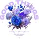 Μπουκέτο με μπλε, μοβ και λευκά λουλούδια σε μαύρο φόντο. Κείμενα «Good Things» και «Are Just Around the Corner».
