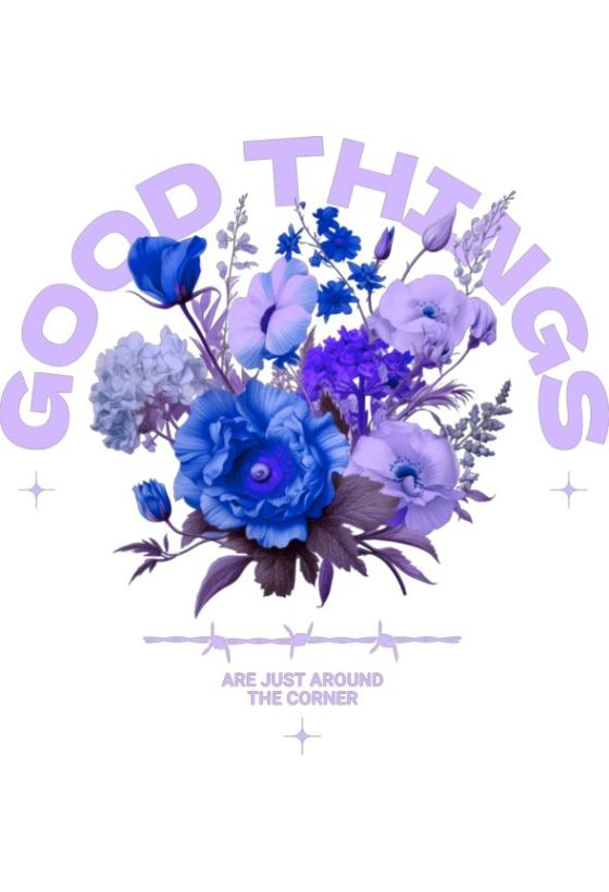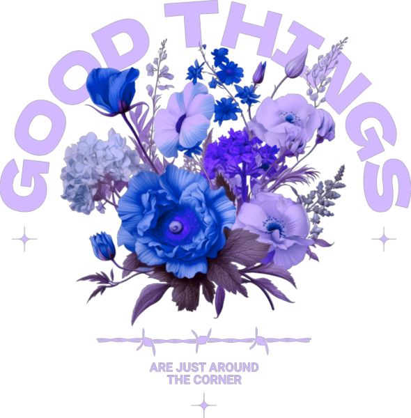 Μπουκέτο με μπλε, μοβ και λευκά λουλούδια σε μαύρο φόντο. Κείμενα «Good Things» και «Are Just Around the Corner».