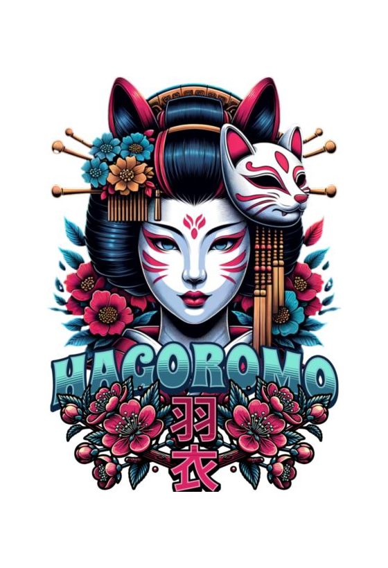 Γυναίκα με μάσκα kitsune και άνθη, σε ιαπωνικό ύφος. Κείμενα «Hagoromo» και το kanji 羽衣.