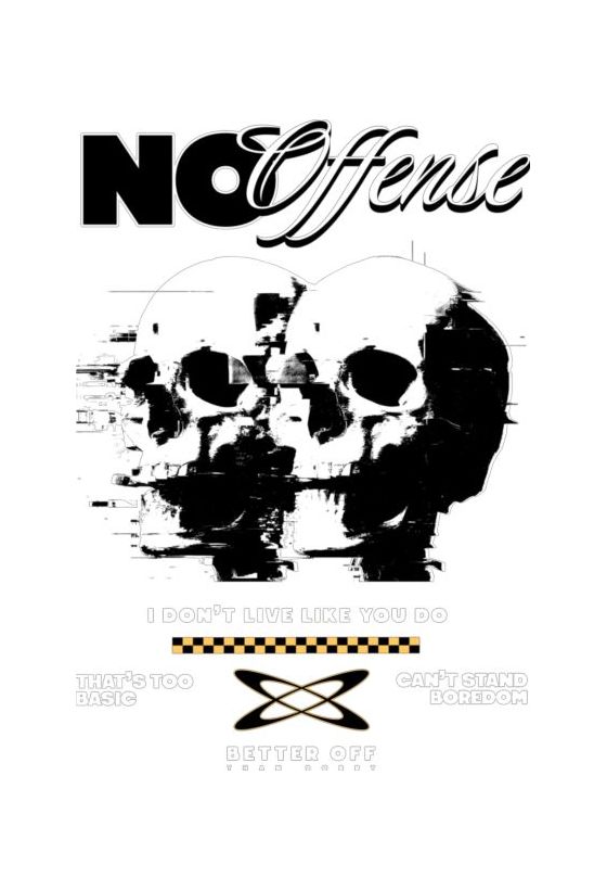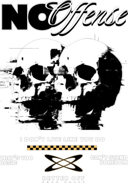 Δύο παραμορφωμένα κρανία με κείμενα «NO Offense», «I DON'T LIVE LIKE YOU DO». Επαναστατικό μήνυμα.