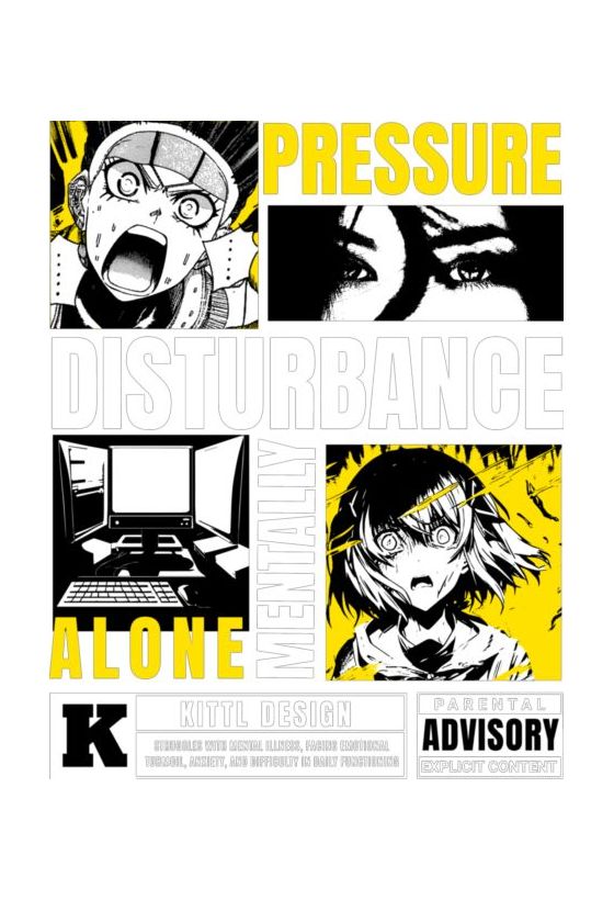 Manga φιγούρες με εκφράσεις φόβου και απομόνωσης. Κείμενα «PRESSURE», «MENTALLY ALONE». Θέμα ψυχικής δυσφορίας.
