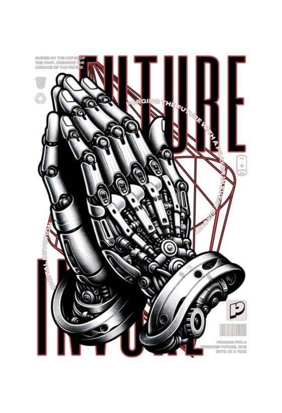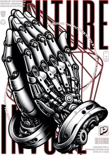 Δύο ρομποτικά χέρια σε στάση προσευχής. Κείμενα για ψηφιακή αφοσίωση. Θέμα τεχνητής νοημοσύνης και πίστης.