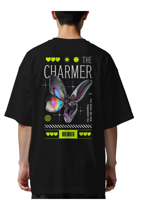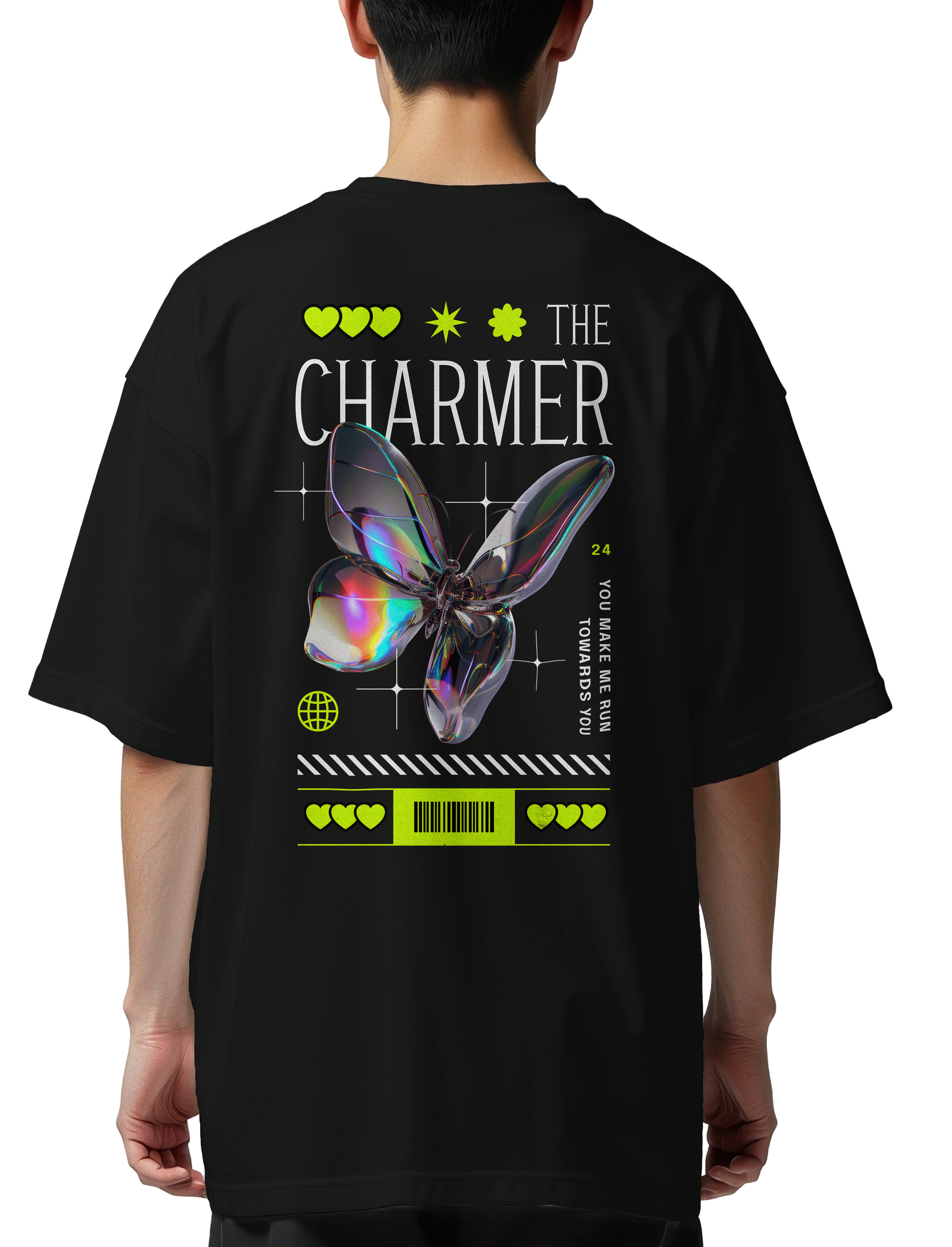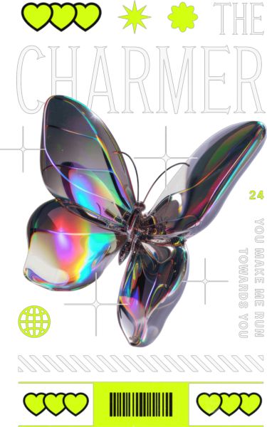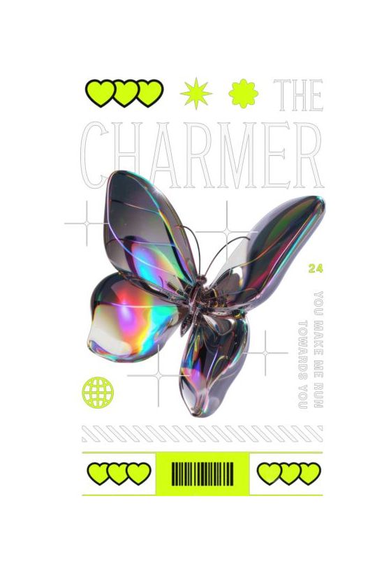 Ιριδίζουσα πεταλούδα με νέον στοιχεία, κείμενο "THE CHARMER".