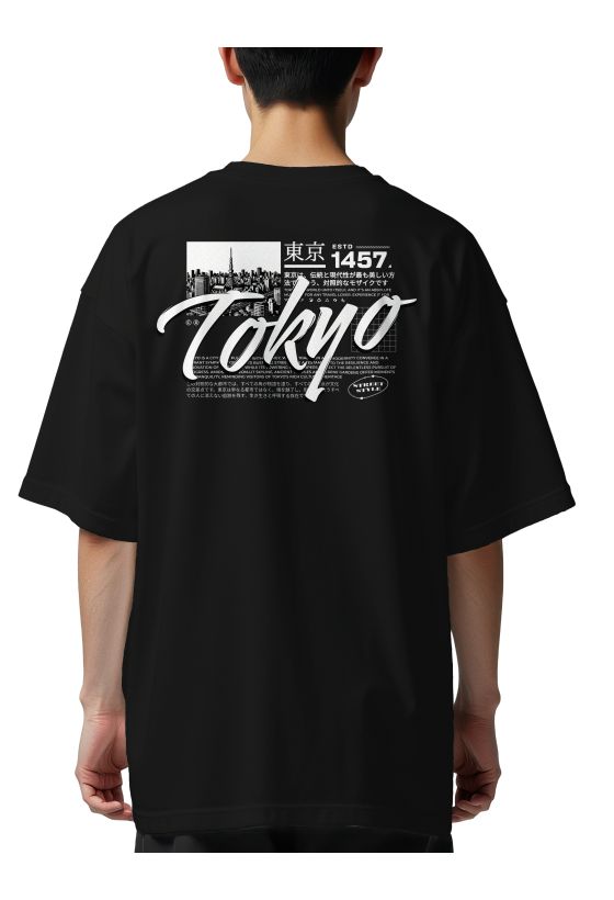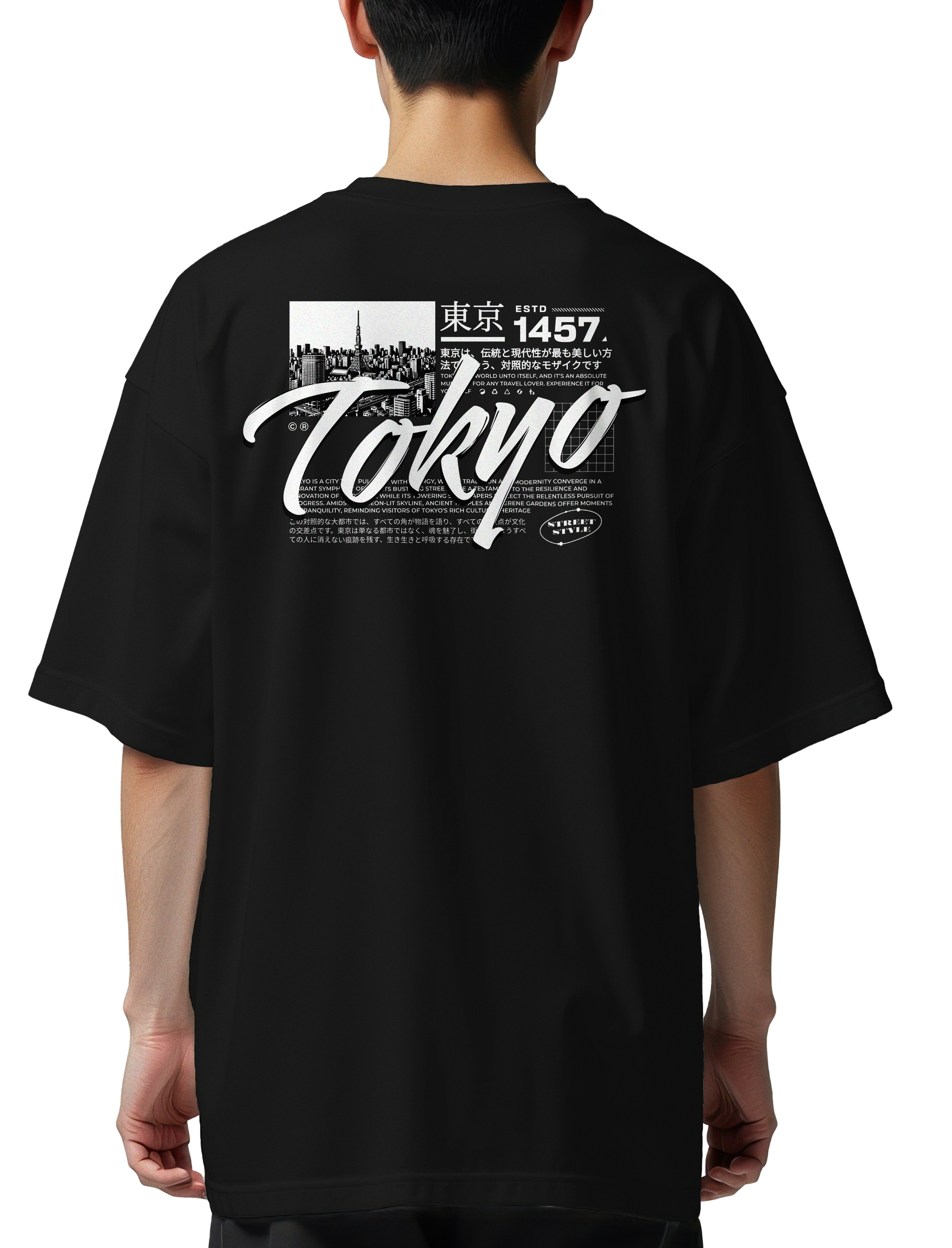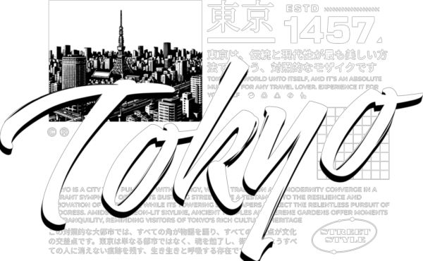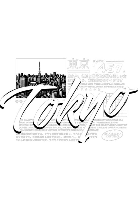 Κείμενο «Tokyo» με αστικό τοπίο, Πύργο Τόκιο και στοιχεία street style.