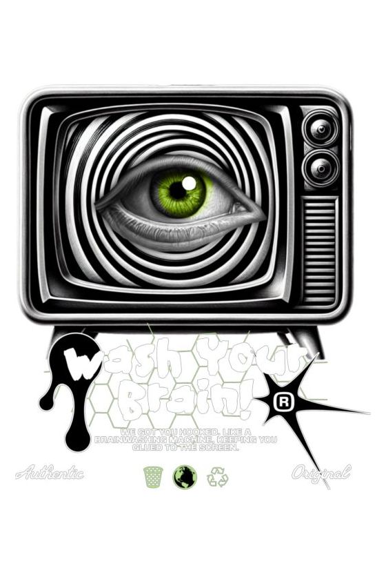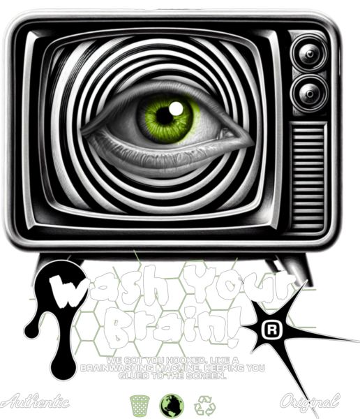 Ρετρό TV με σπειροειδές μοτίβο και πράσινο μάτι· «Πλύνε τον εγκέφαλό σου!», κριτική ΜΜΕ.