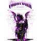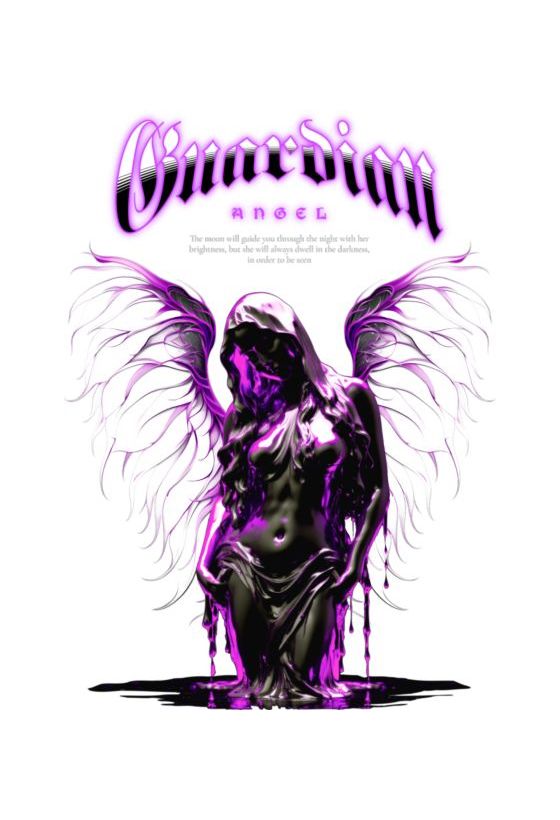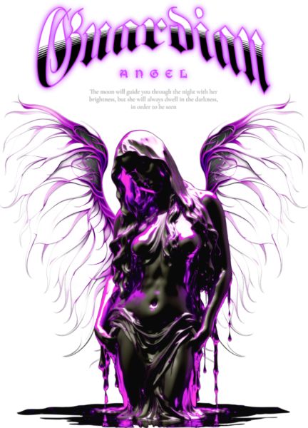 Σκούρο άγαλμα αγγέλου με μωβ λάμψη και φτερά που στάζουν. Κείμενο «Φύλακας Άγγελος» και ποιητική επιγραφή για καθοδήγηση.