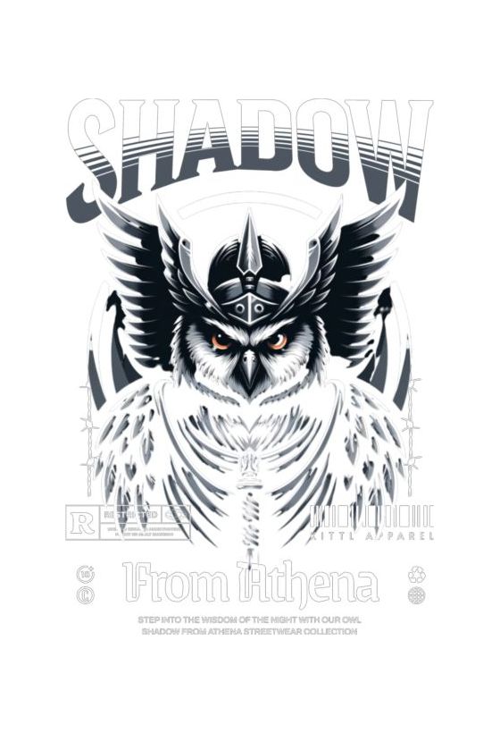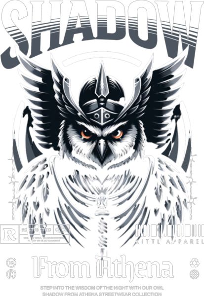 Κουκουβάγια-πολεμιστής με πορτοκαλί μάτια και φτερά. Συρματοπλέγματα πλαισιώνουν. Κείμενο «Shadow From Athena».