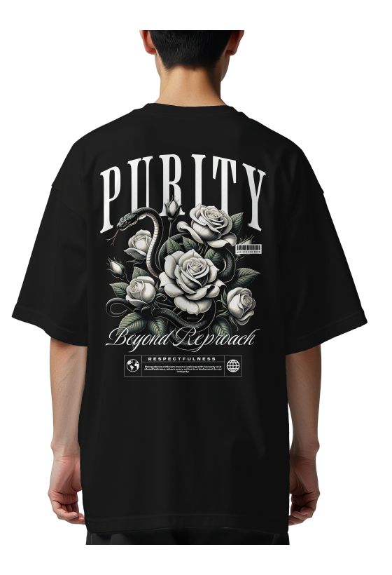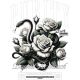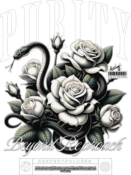 Μαύρο φίδι μπλεγμένο σε λευκά τριαντάφυλλα. Κείμενα «PURITY» και «Beyond Reproach». Θέμα καθαρότητας και ακεραιότητας.
