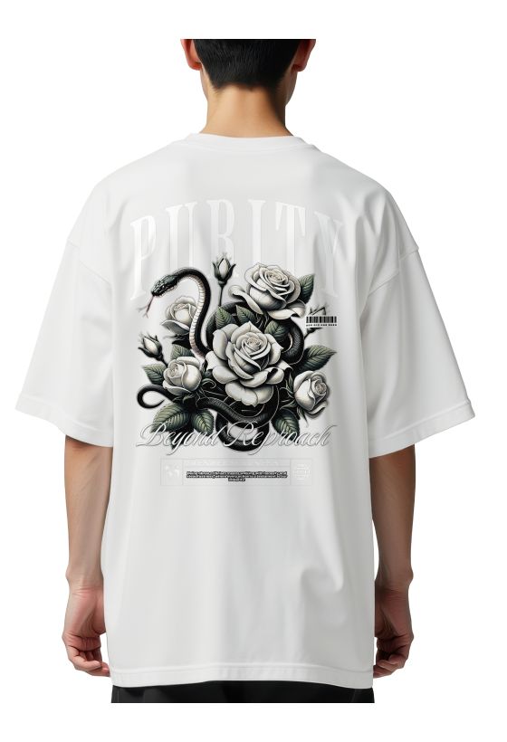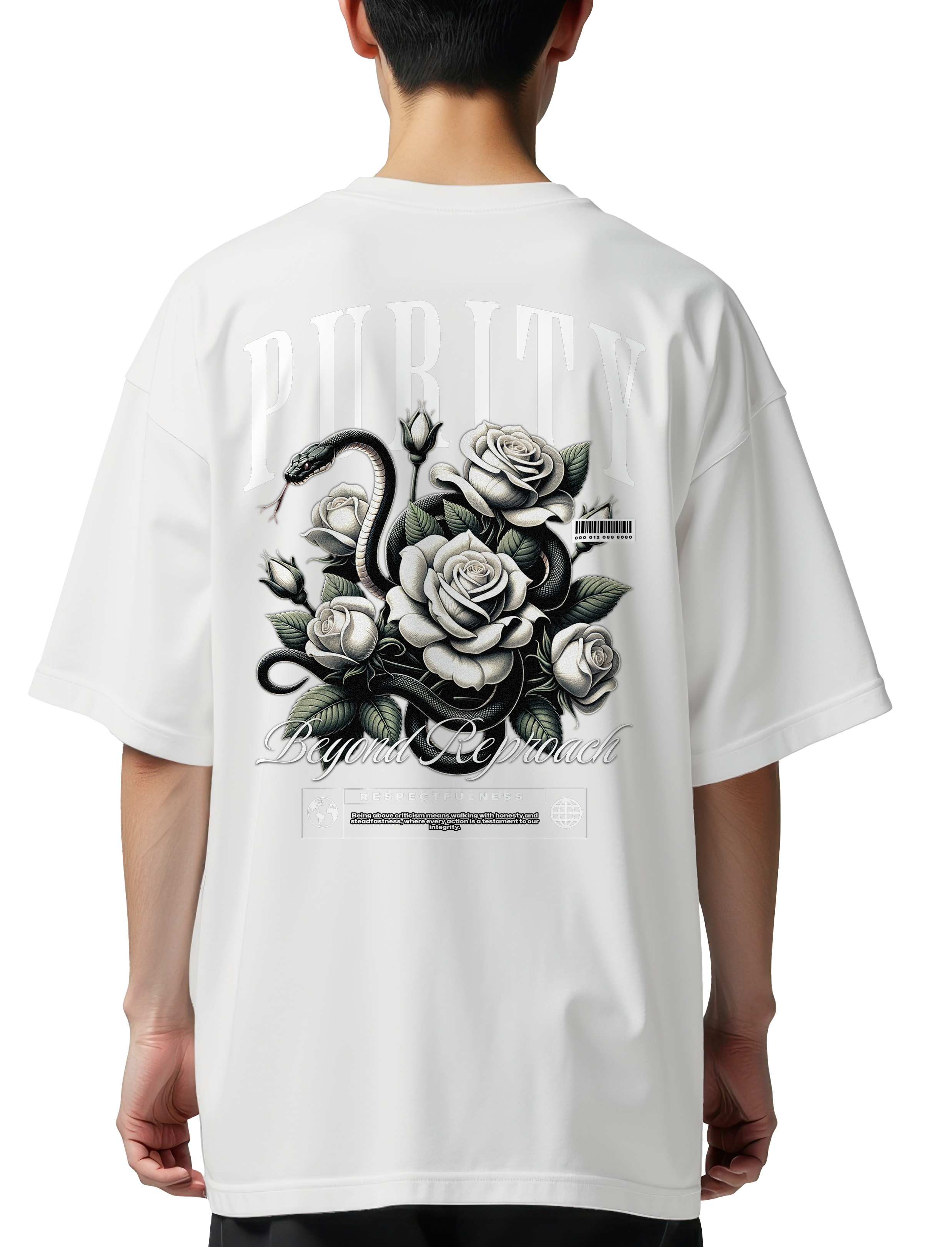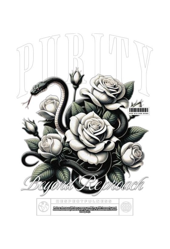 Μαύρο φίδι μπλεγμένο σε λευκά τριαντάφυλλα. Κείμενα «PURITY» και «Beyond Reproach». Θέμα καθαρότητας και ακεραιότητας.