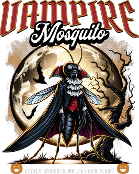 Κουνούπι-βρικόλακας μπροστά σε πανσέληνο· «VAMPIRE Mosquito», Halloween αισθητική.