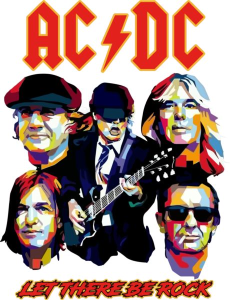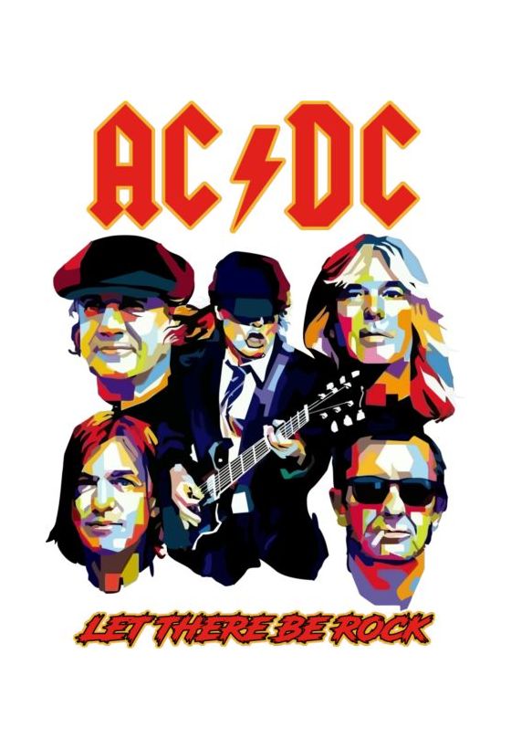 Πορτρέτα μελών AC/DC σε pop art στυλ, Angus Young με κιθάρα στο κέντρο, λογότυπο κεραυνού και φράση «LET THERE BE ROCK».