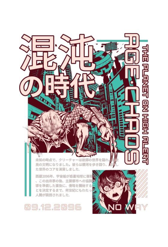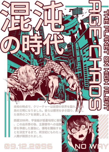 Εξωγήινο πλάσμα σε δυστοπική πόλη. Κείμενα EN/JP, τίτλος «Age of Chaos», αφήγηση για εισβολή στη Γη το 2096.