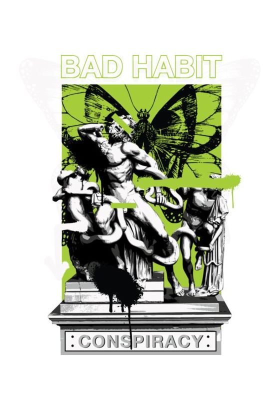 Γλυπτό Laocoön με neon φόντο, φτερά πεταλούδας και κείμενο «BAD HABIT».