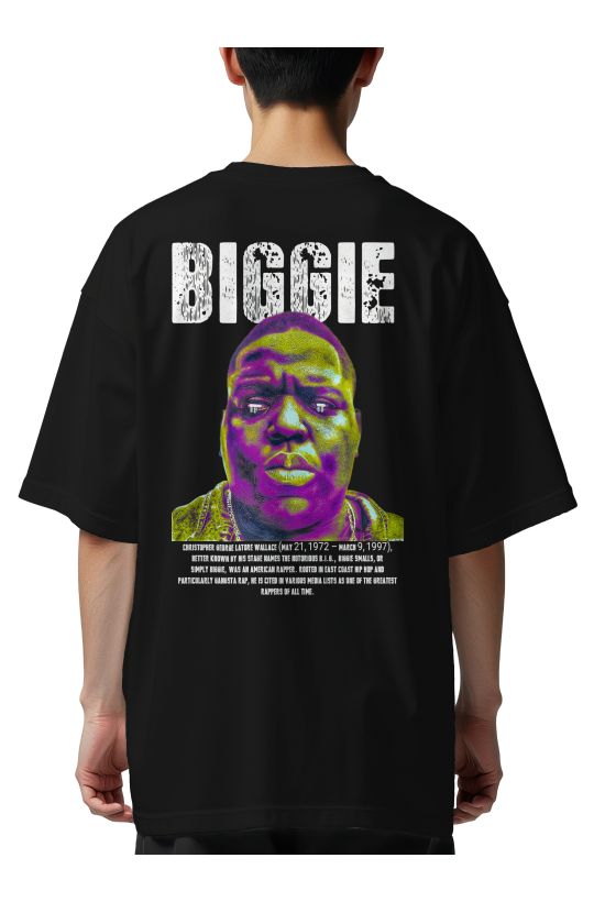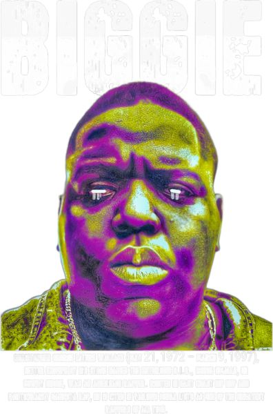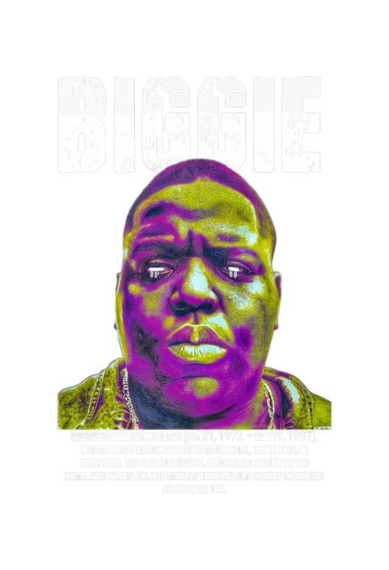 Πορτρέτο Notorious B.I.G. (Biggie Smalls) σε κίτρινο-μωβ, επιγραφή «BIGGIE».