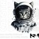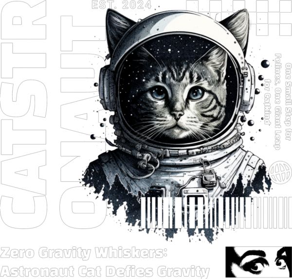 Τιγρέ γάτα με κράνος αστροναύτη. Κείμενα: «CATSTRONAUT», «One Small Step for Felines». Χιουμοριστικό θέμα.