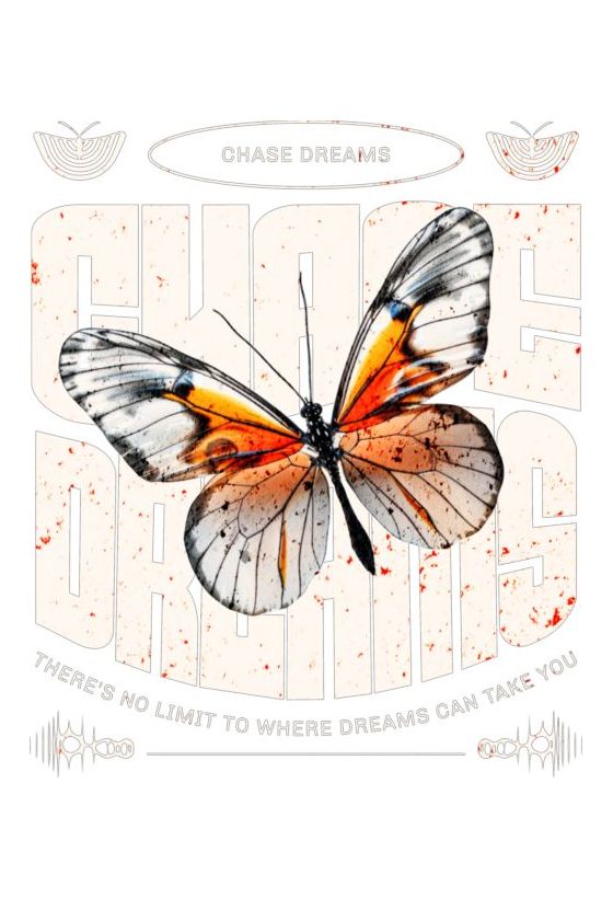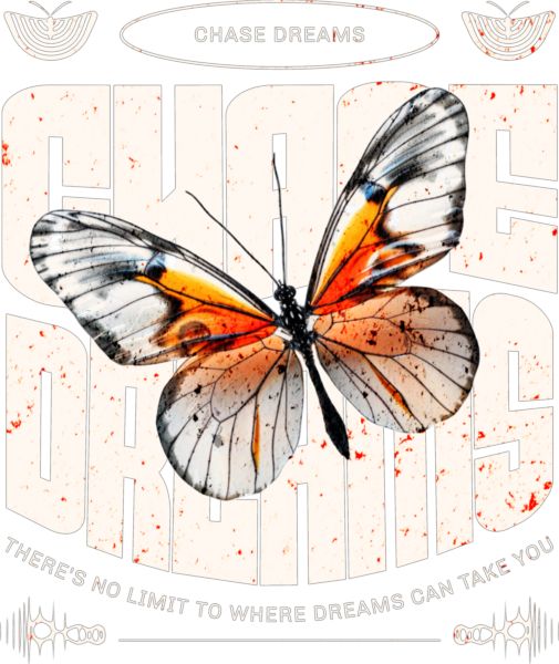 Μεγάλη πεταλούδα σε πορτοκαλί-λευκό, με κείμενο «Chase Dreams». Φράση για όρια ονείρων και grunge φόντο.