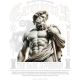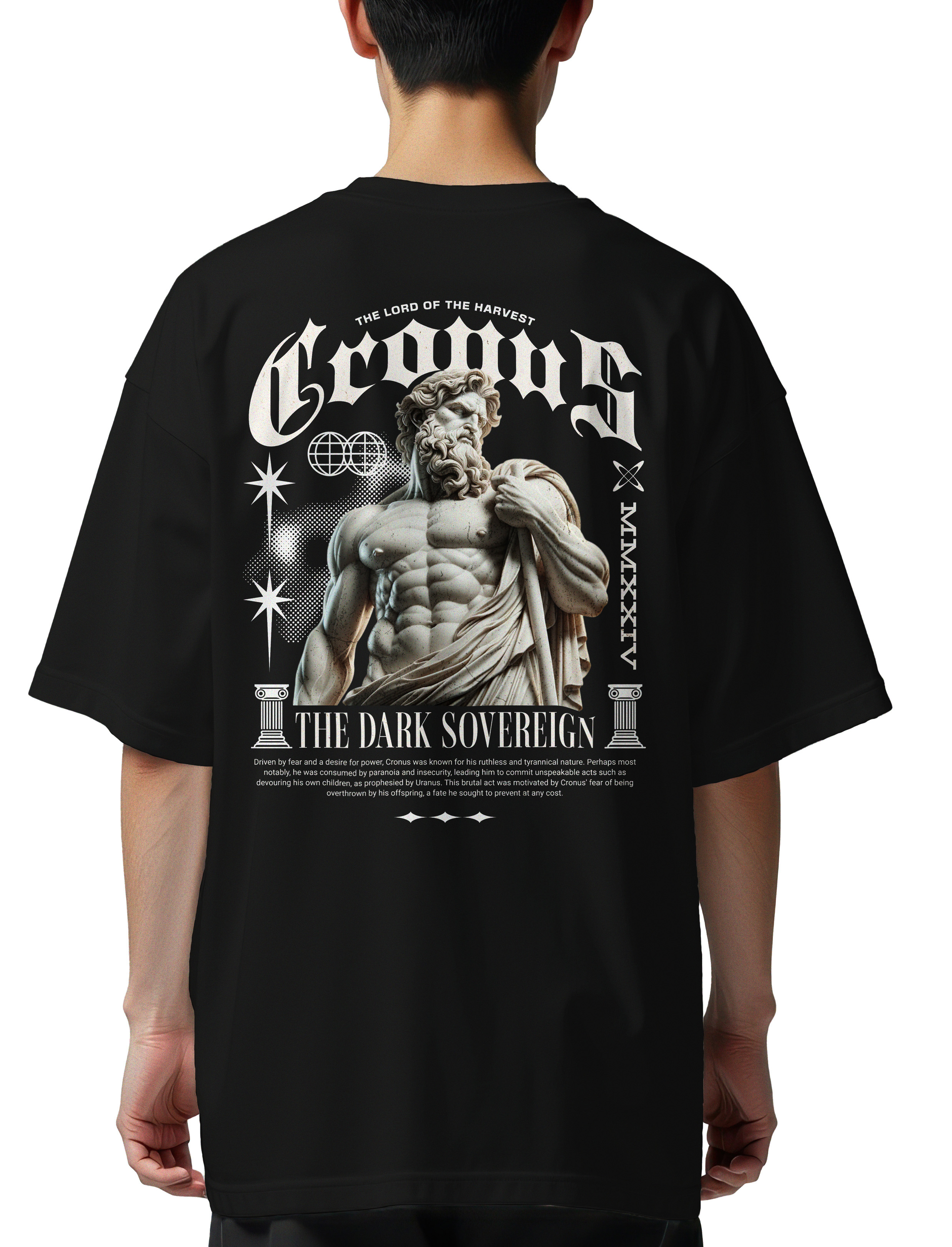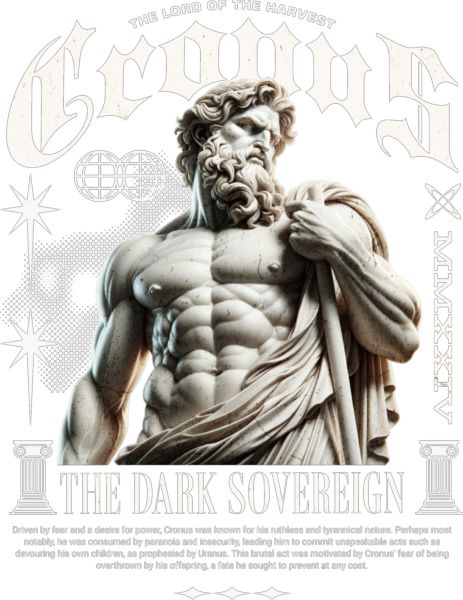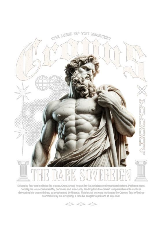 Άγαλμα Κρόνου σε μαύρο φόντο, τίτλος «CRONUS», ουράνια σύμβολα, περιγραφή του μύθου.