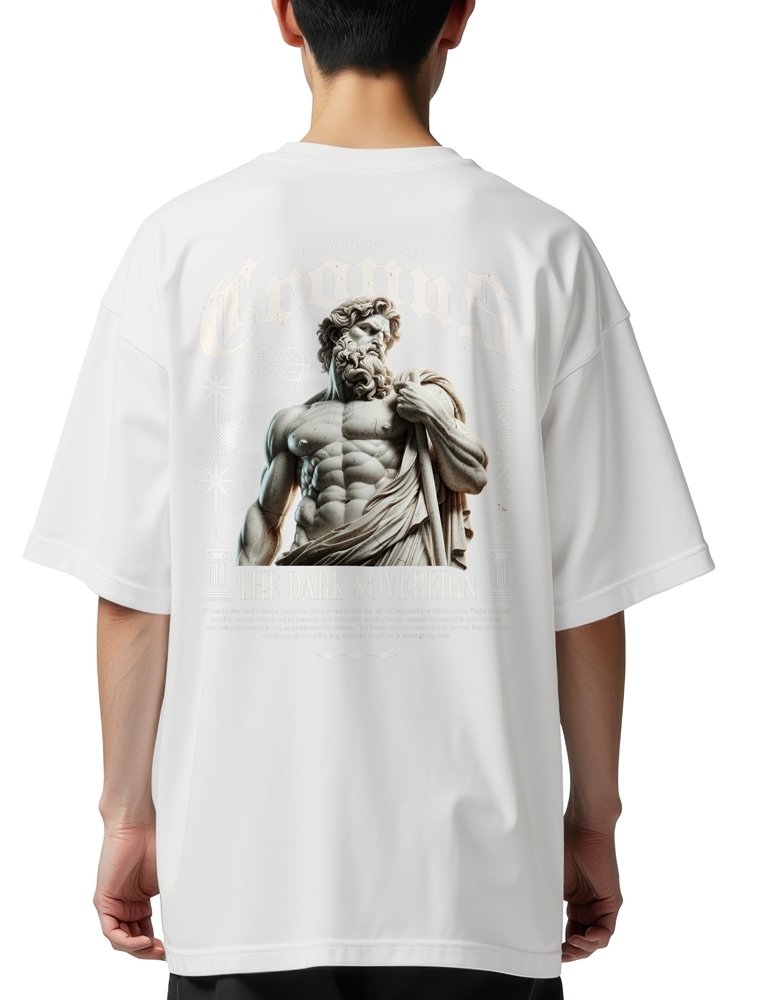 Άγαλμα Κρόνου σε μαύρο φόντο, τίτλος «CRONUS», ουράνια σύμβολα, περιγραφή του μύθου.