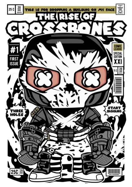 Funko Pop Crossbones, μάσκα κρανίου, εξοπλισμός, εξώφυλλο κόμικ με τίτλο και συννεφάκια.