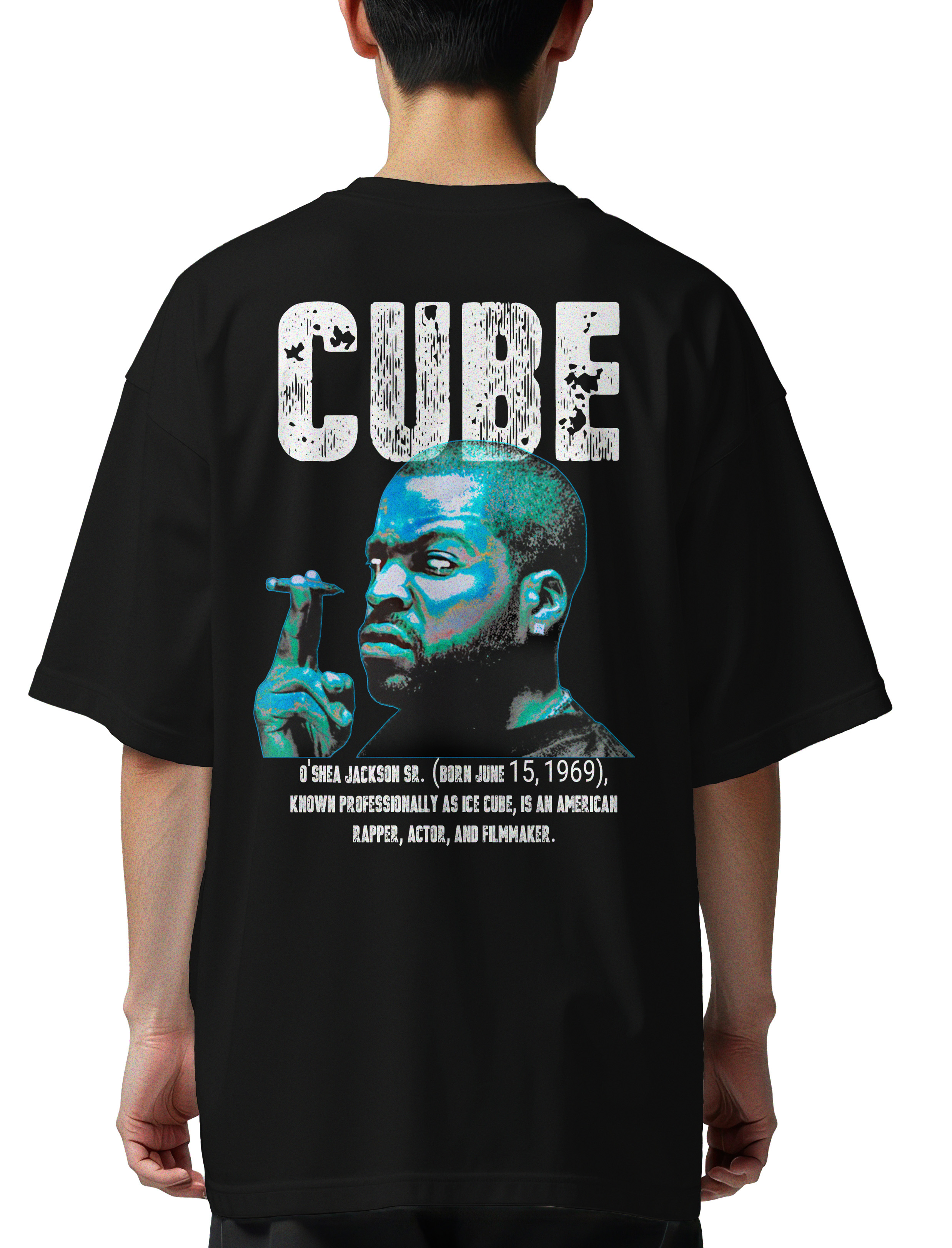 Πορτρέτο Ice Cube σε ποπ αρτ μπλε/πράσινο, κείμενο «CUBE», βιογραφικά στοιχεία.