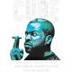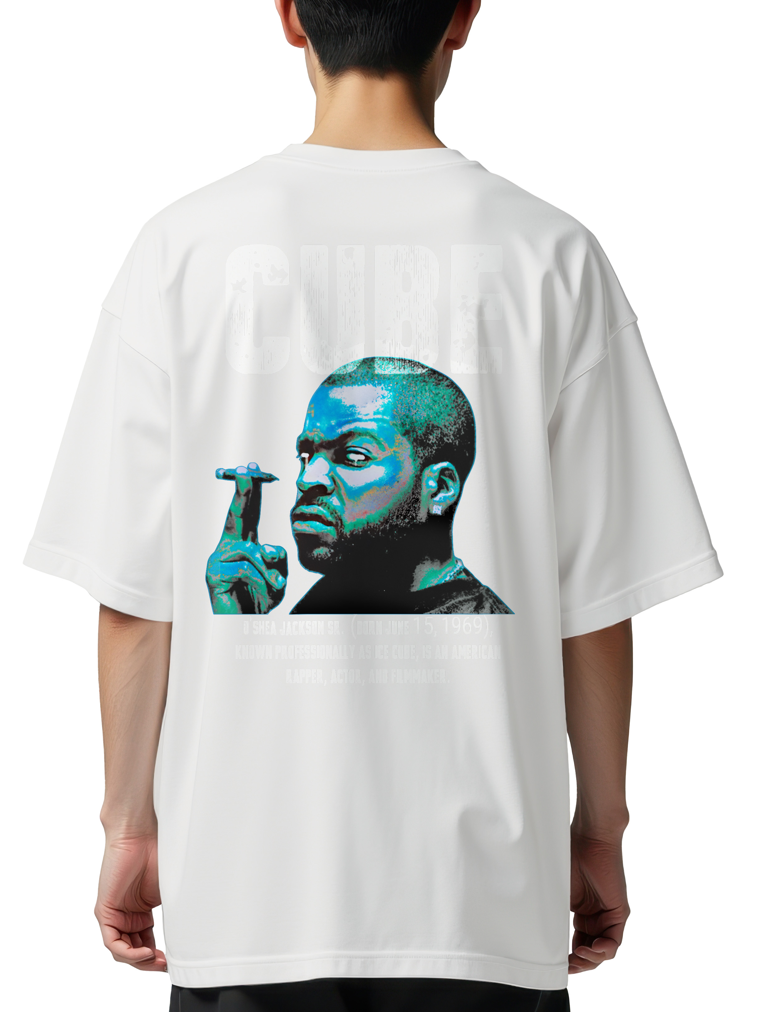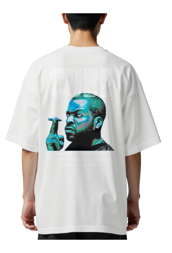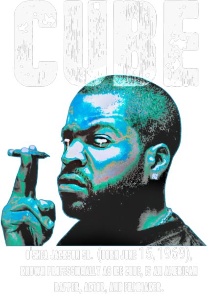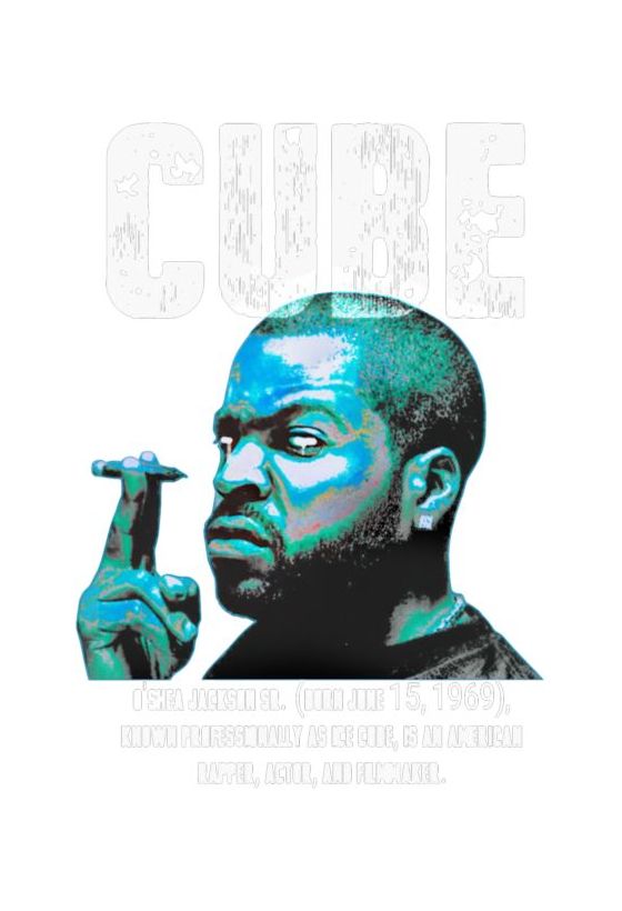 Πορτρέτο Ice Cube σε ποπ αρτ μπλε/πράσινο, κείμενο «CUBE», βιογραφικά στοιχεία.