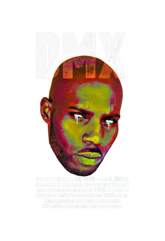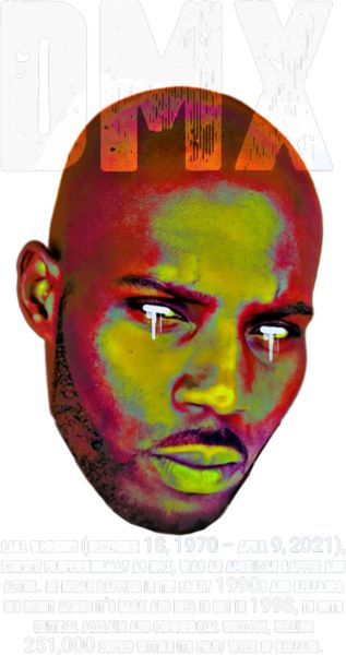 Πορτρέτο DMX σε ψυχεδελικά χρώματα, κείμενο με όνομα και βιογραφικά στοιχεία.
