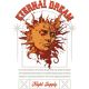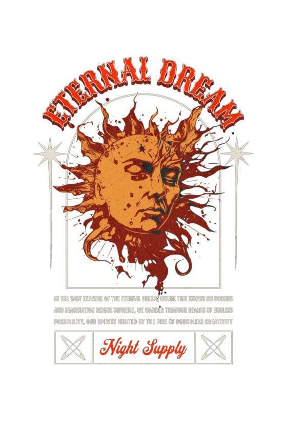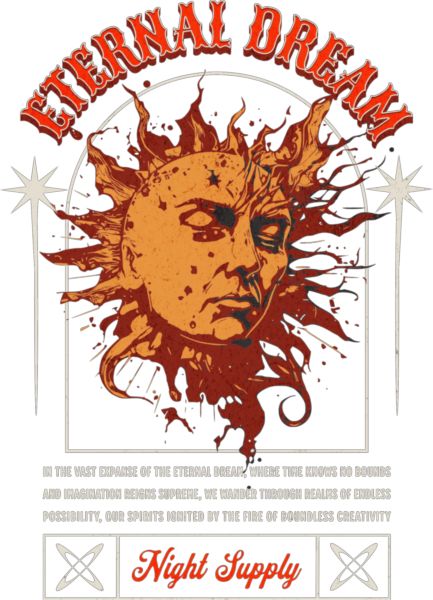 Ήλιος με ανθρώπινο πρόσωπο που μοιάζει να λιώνει, σε πορτοκαλί-κόκκινο. Κείμενο «Αιώνιο Όνειρο» και περιγραφή για φαντασία και δημιουργικότητα.