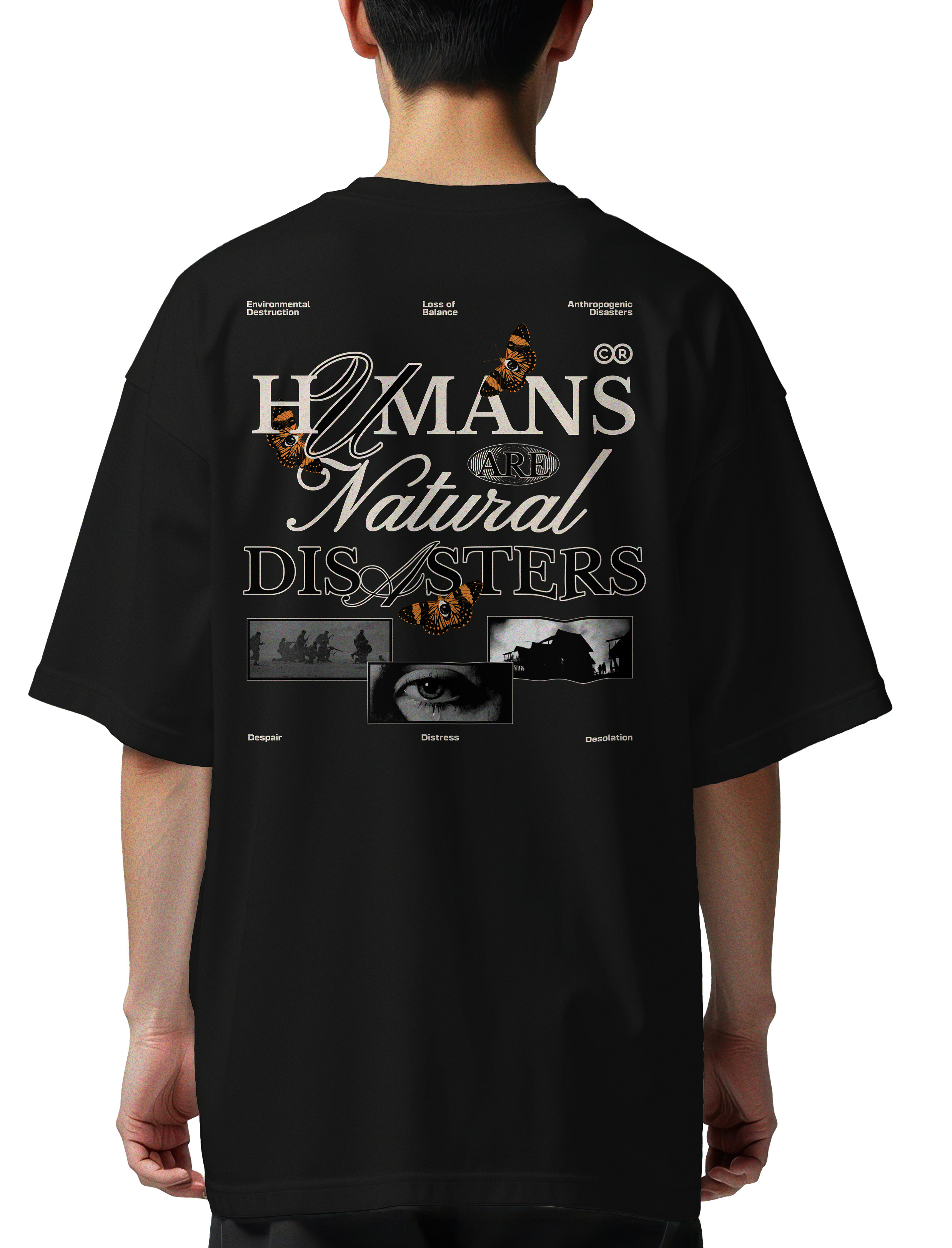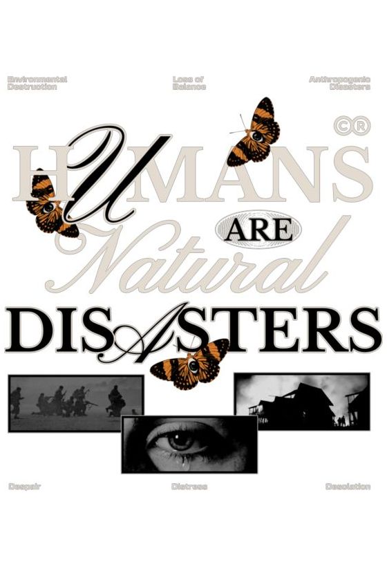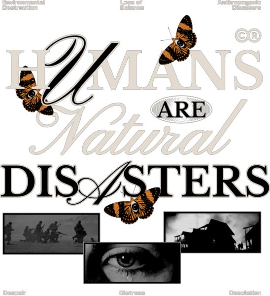 Δήλωση «Οι ΑΝΘΡΩΠΟΙ ΕΙΝΑΙ ΦΥΣΙΚΕΣ ΚΑΤΑΣΤΡΟΦΕΣ» με πεταλούδες και εικόνες πολέμου και καταστροφής.