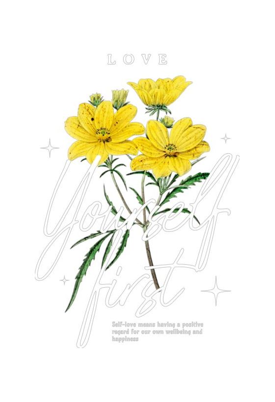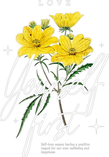 Μπουκέτο κίτρινα λουλούδια σε μαύρο φόντο. Κείμενο «Αγαπήστε πρώτα εσάς» και μήνυμα αυτοφροντίδας για ευημερία και ευτυχία.