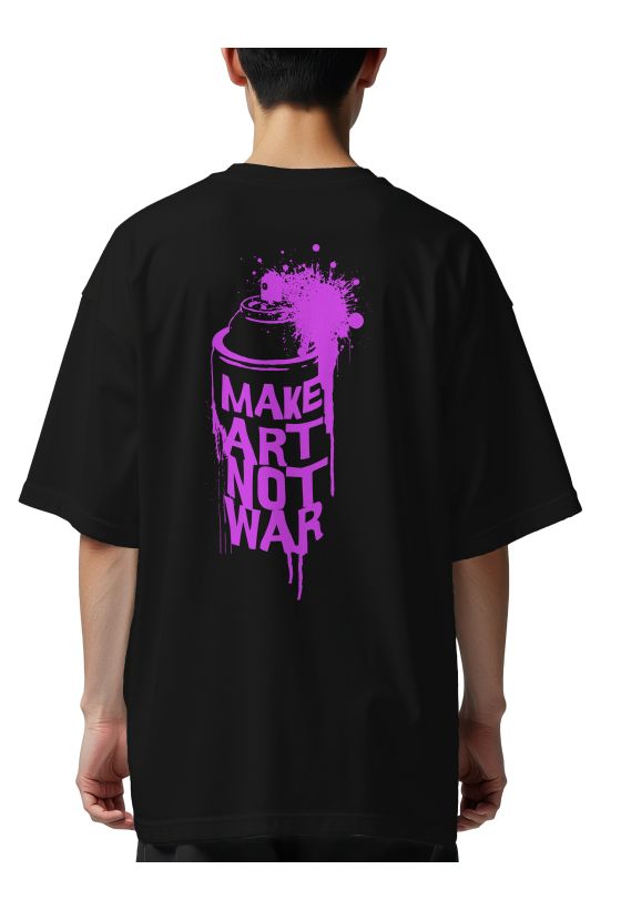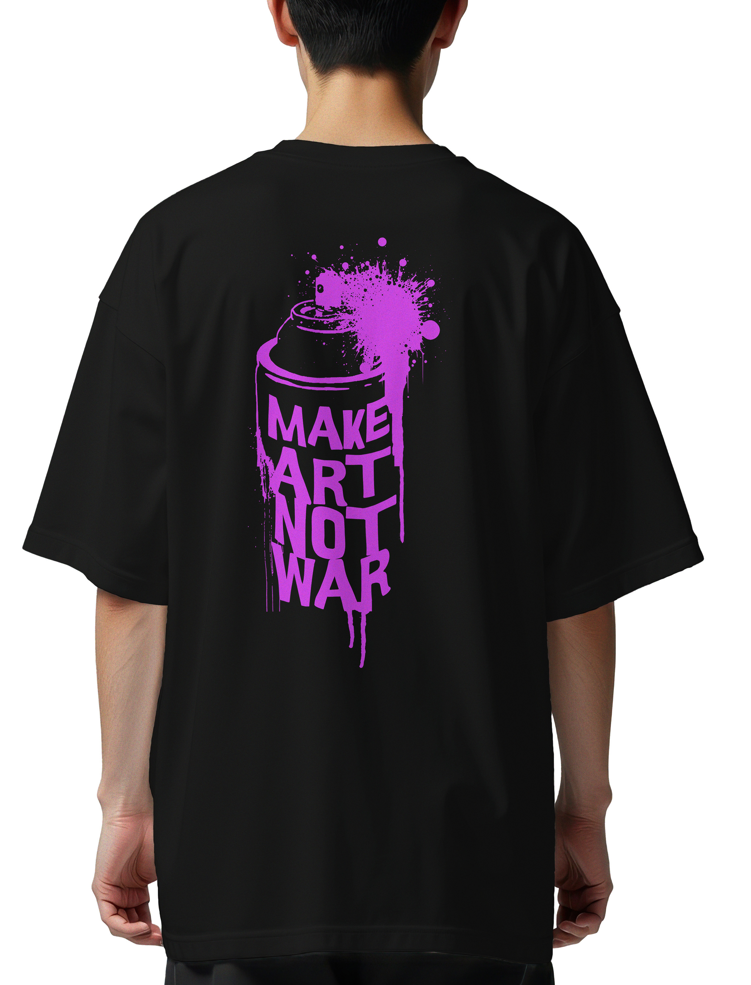 Δοχείο μπογιάς εκρήγνυται σε μωβ χρώμα σε μαύρο φόντο. Κείμενο «MAKE ART NOT WAR». Αντιπολεμικό street art.