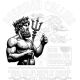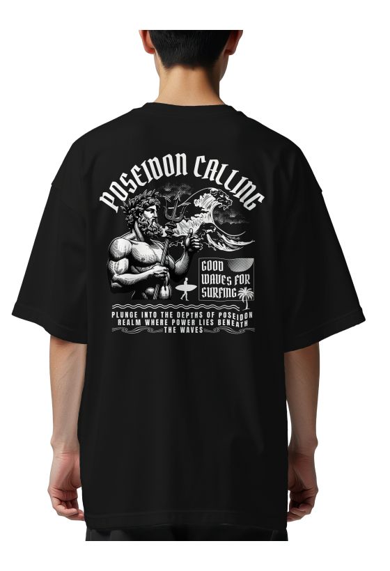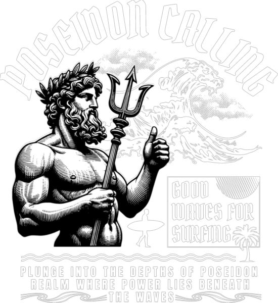 Ο Ποσειδώνας με τρίαινα και κύμα πίσω του. Κείμενο «Good Waves for Surfing» και φράση για τον «βασιλιά Ποσειδώνα».