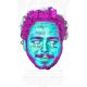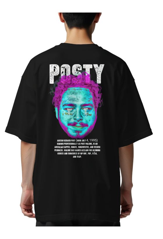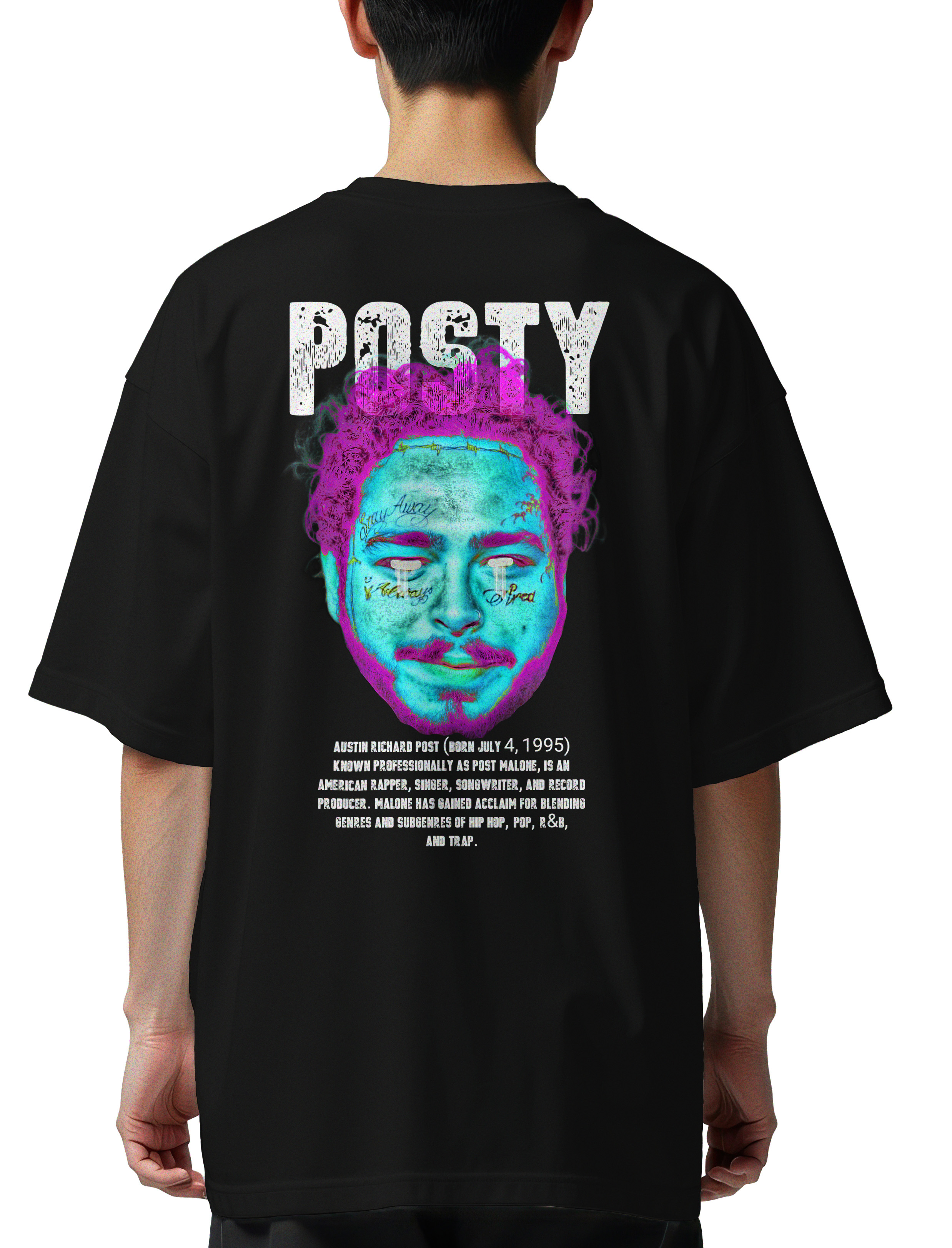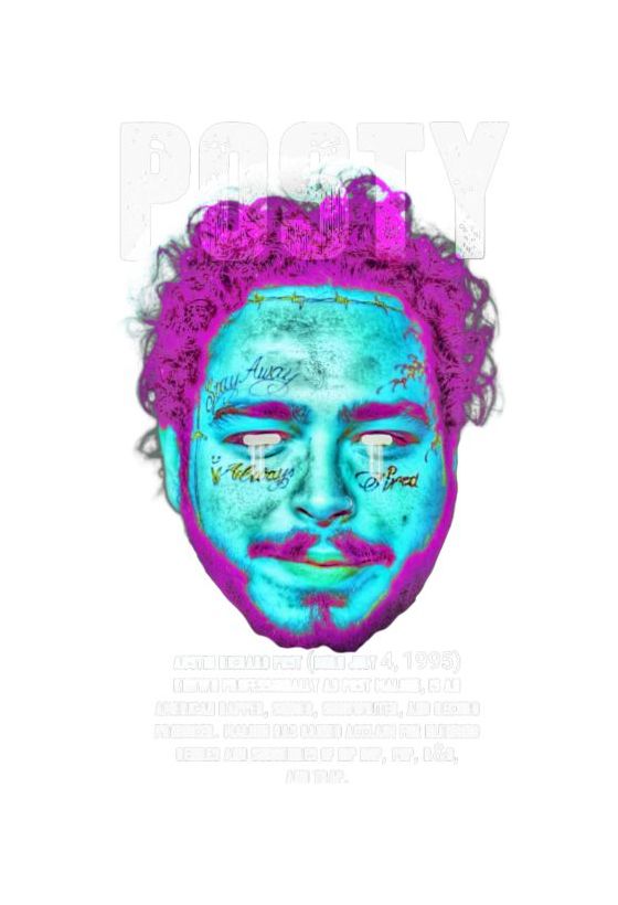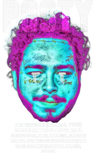 Πορτρέτο Post Malone σε μπλε-ματζέντα με τατουάζ προσώπου, κείμενο "POSTY".