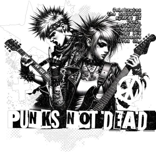 Δύο μουσικοί πανκ με κιθάρες, σε δερμάτινα μπουφάν. Κείμενο «Punks Not Dead».