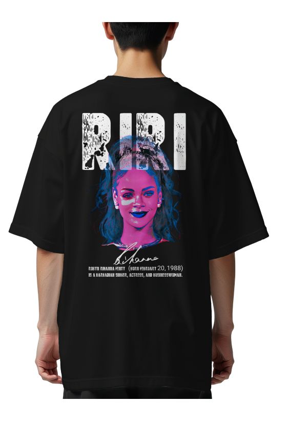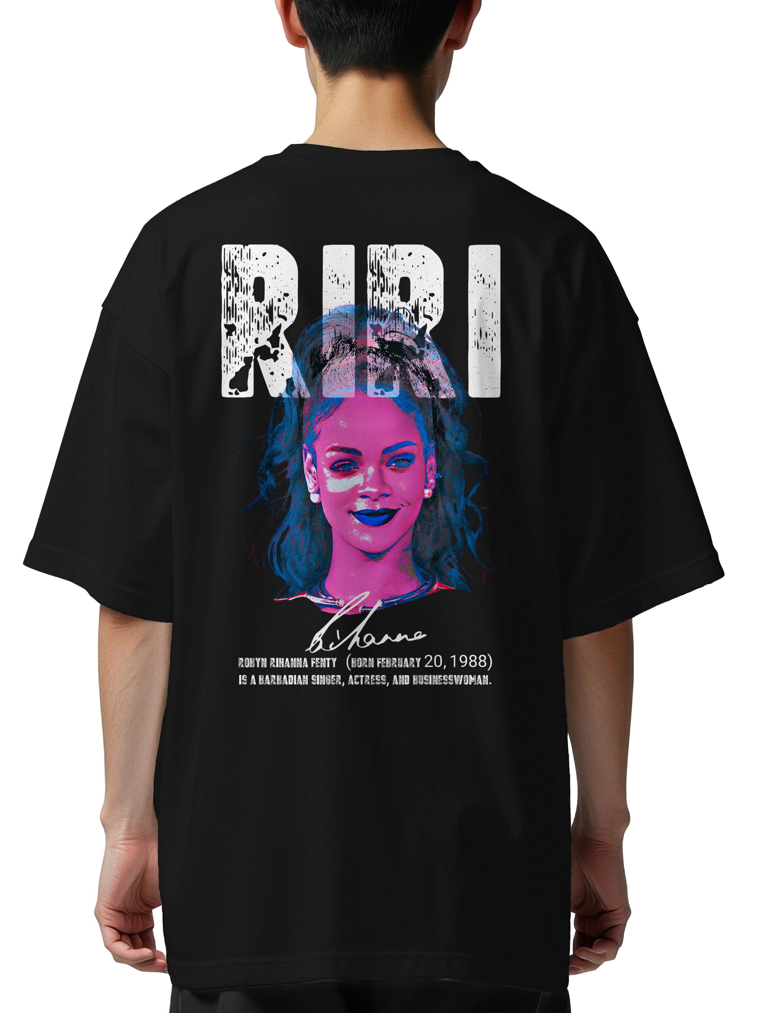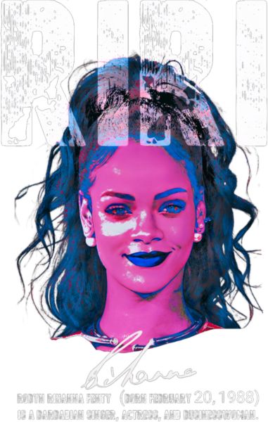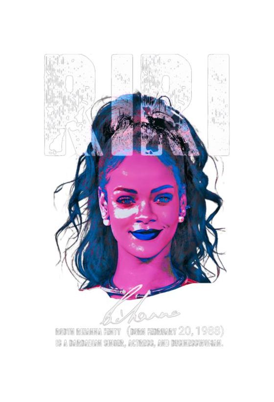 Πορτρέτο Rihanna σε ροζ-μπλε τόνους, κείμενο "RIRI" και βιογραφικά στοιχεία.