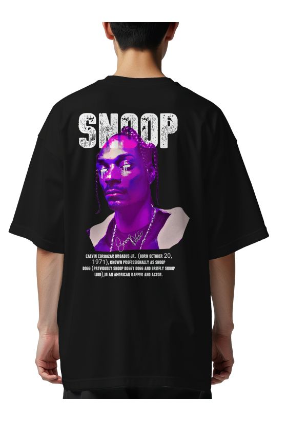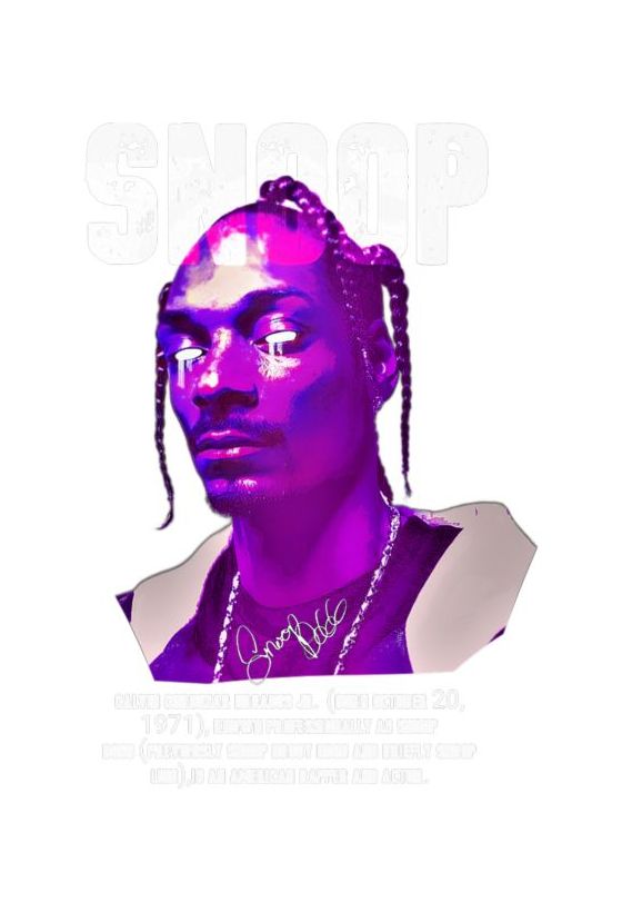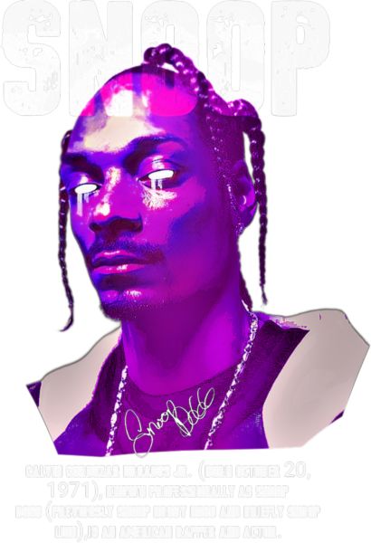 Snoop Dogg πορτρέτο pop art σε μωβ, λογότυπο "SNOOP" και βιογραφικά στοιχεία.
