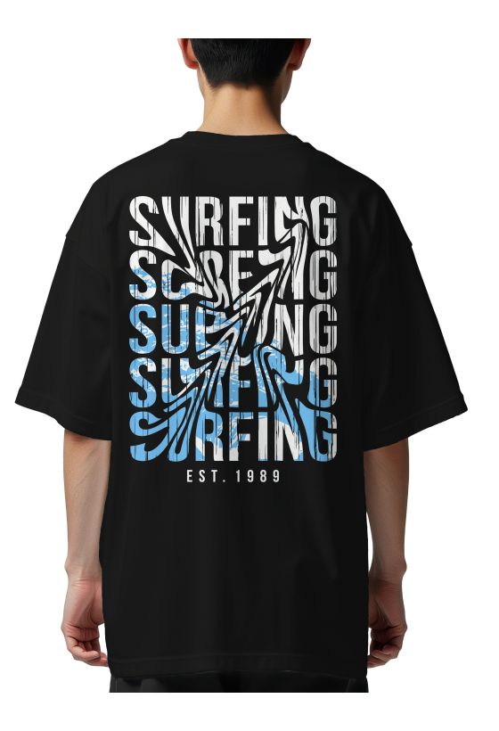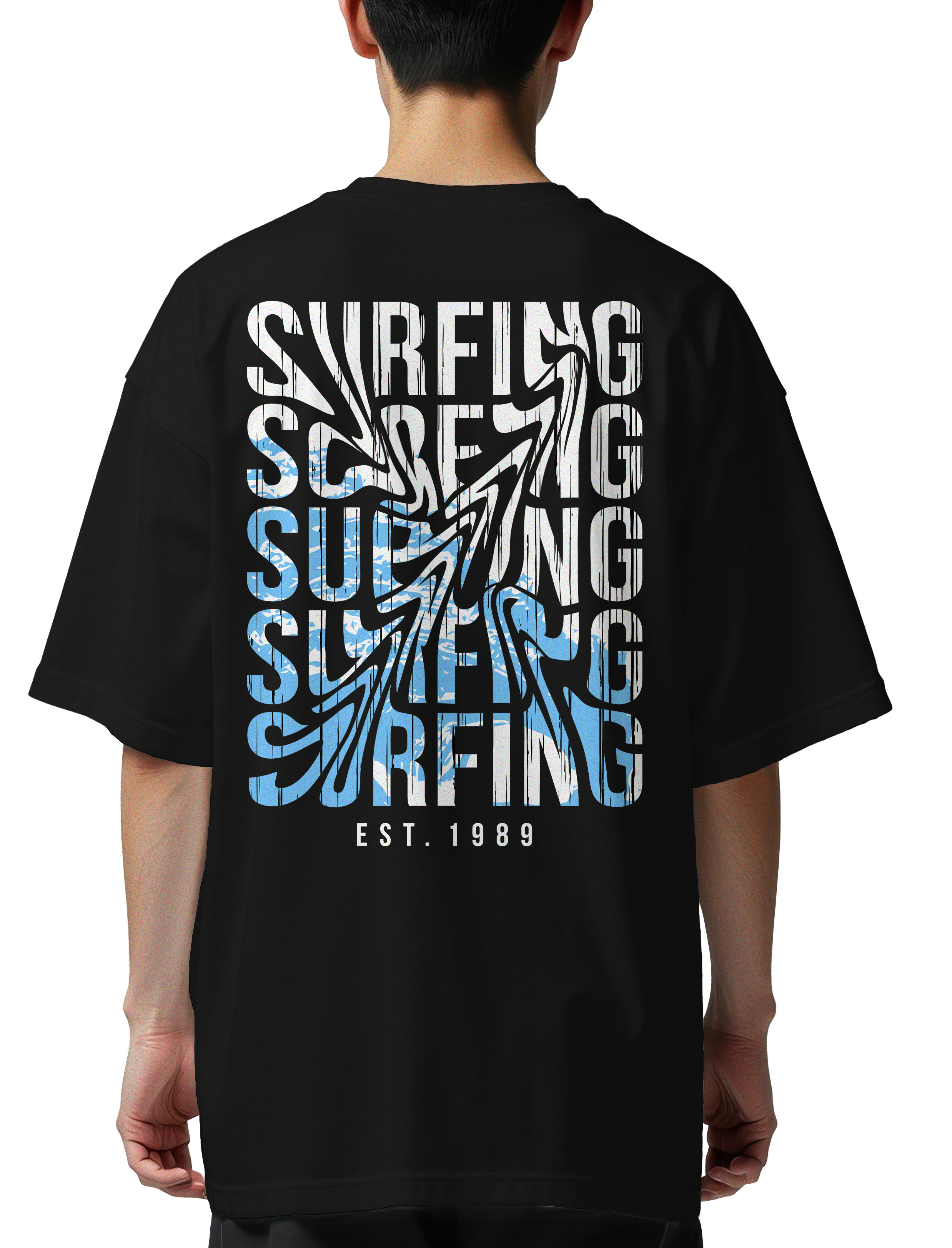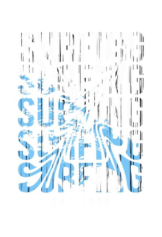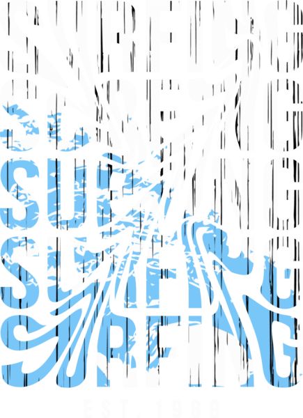 Επανάληψη "SURFING" σε λευκό-γαλάζιο distressed στυλ, κυματιστές γραμμές, "EST. 1989".