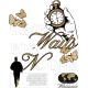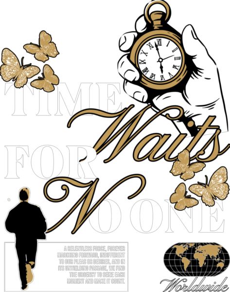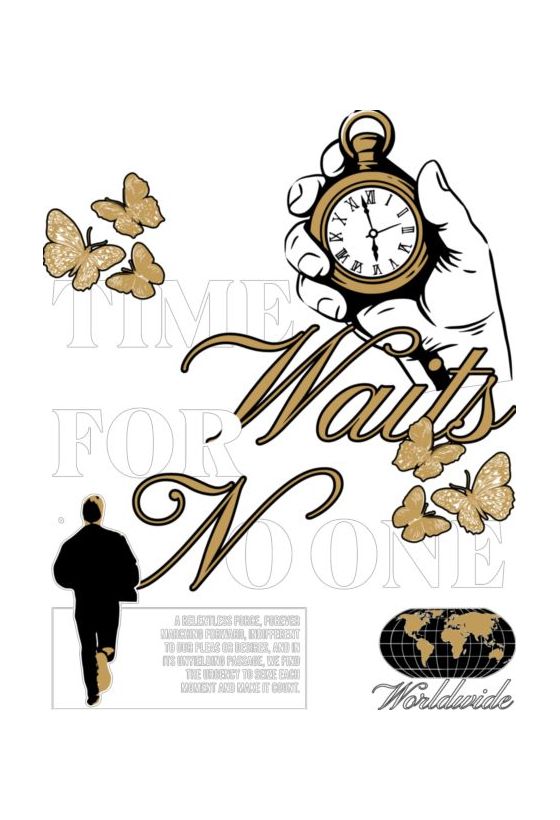 Ρολόι τσέπης με χέρι και πεταλούδες. Κείμενο «TIME Waits FOR No ONE».