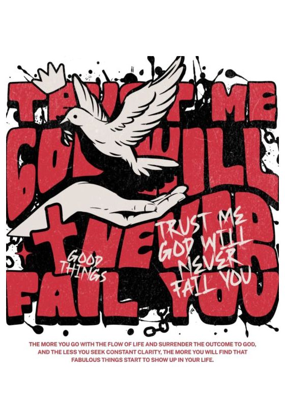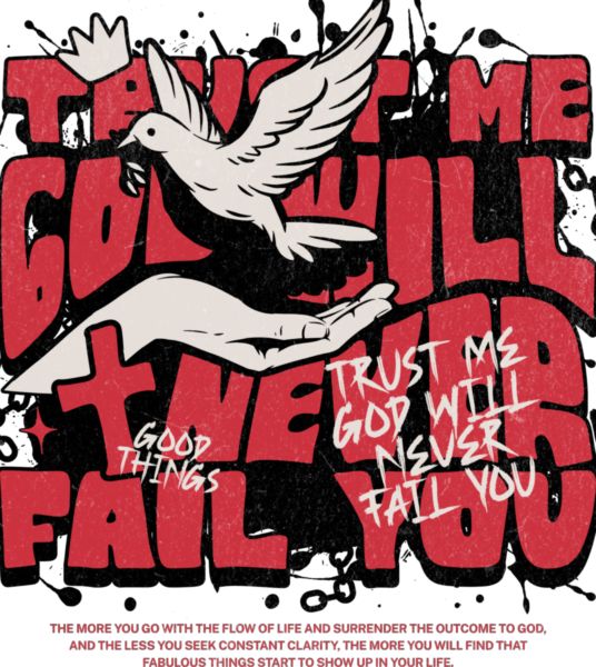 «TRUST ME GOD WILL NEVER FAIL YOU» με περιστέρι/χέρι, στέμμα και σταυρό, vintage grunge.