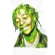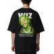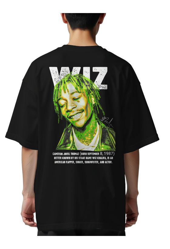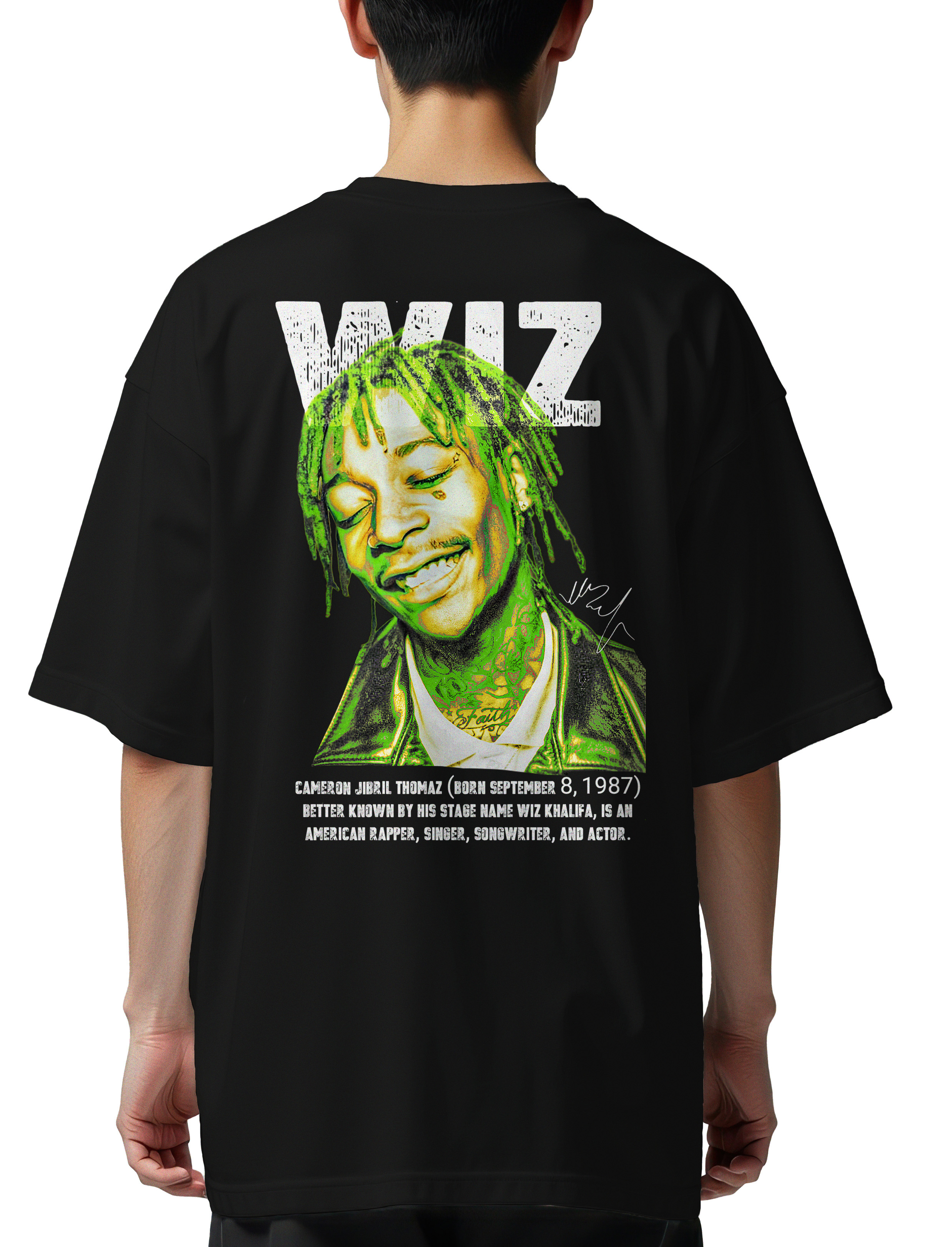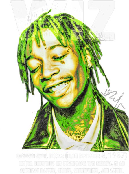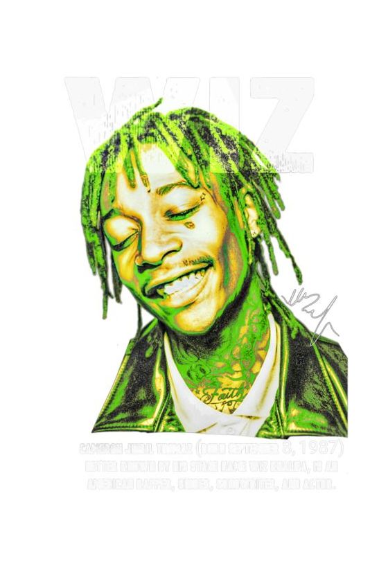 Πορτρέτο Wiz Khalifa σε πράσινο-κίτρινο με λογότυπο "WIZ" και βιογραφικό κείμενο.