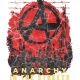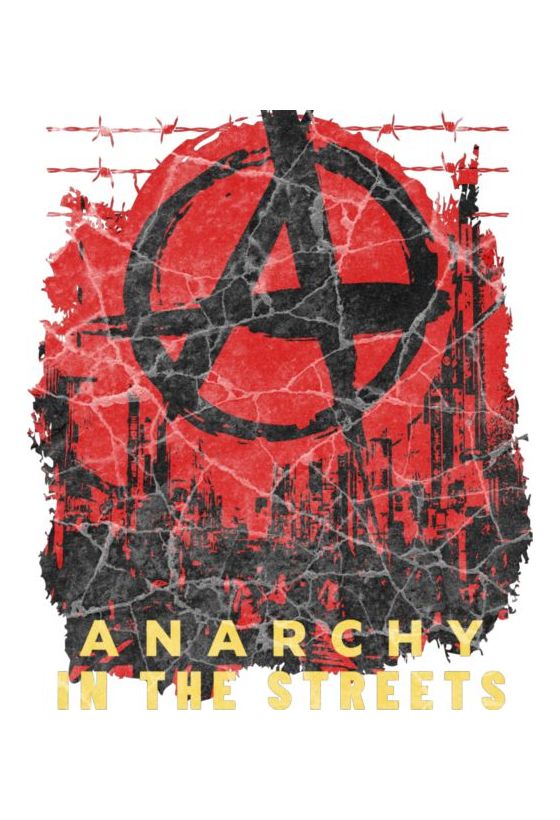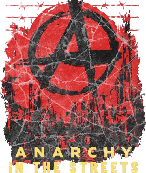 Μαύρο σύμβολο αναρχίας σε κόκκινο φόντο με σιλουέτα πόλης και συρματοπλέγματα. Κείμενο: «ΑΝΑΡΧΙΑ ΣΤΟΥΣ ΔΡΟΜΟΥΣ».