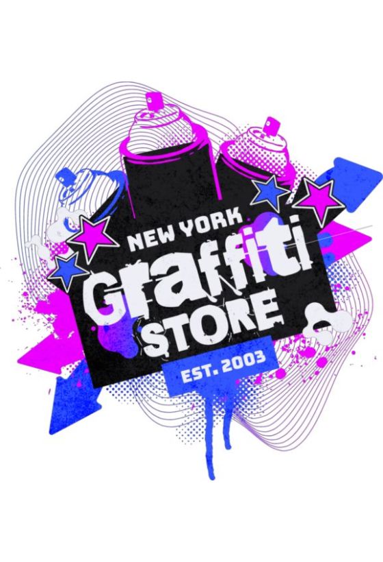 Σχέδιο για «New York Graffiti Store» με σπρέι σε ροζ/μοβ. Κείμενο λευκό.